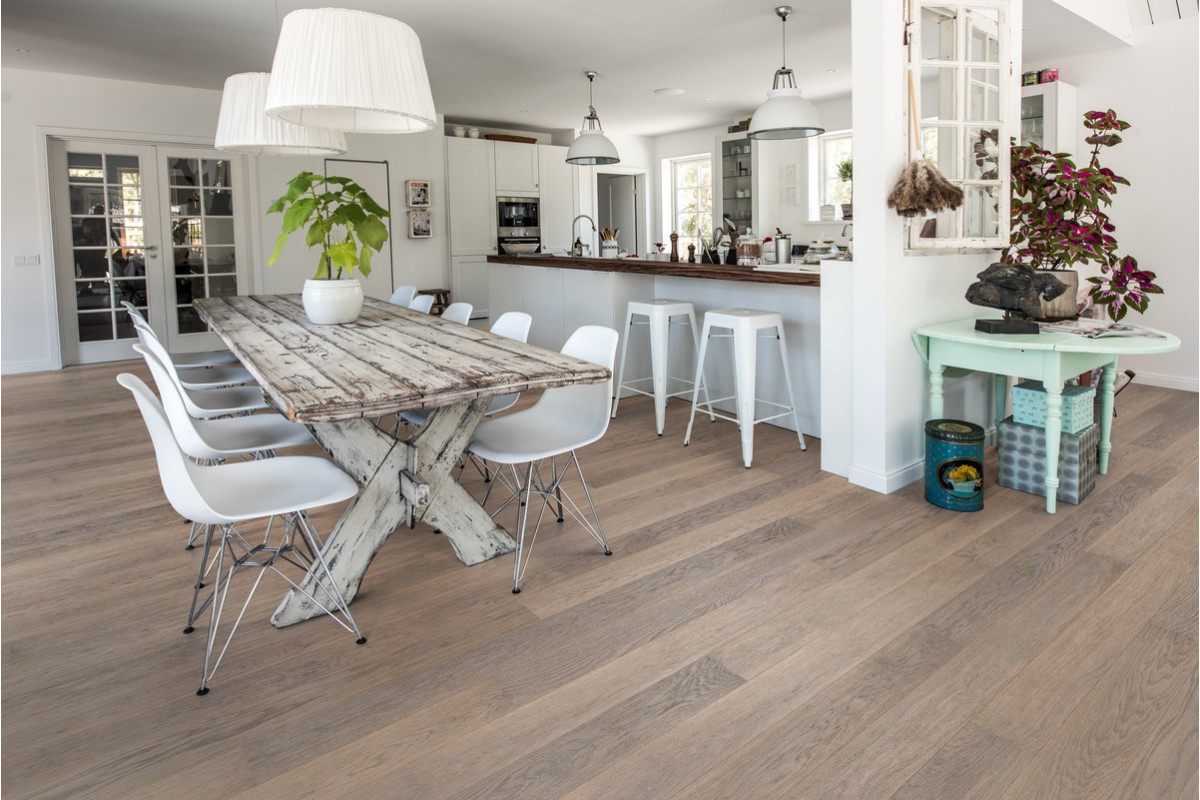 Однополосная паркетная доска Karelia Дуб Story 138 Frostbite — практически белое напольное покрытие, которое украшает нежный сероватый рисунок. Древесные волокна дуба складываются в разнообразный узор, делающий пол очень нарядным. Декоративности добавляет и рельеф поверхности, созданный по технологии браширования.