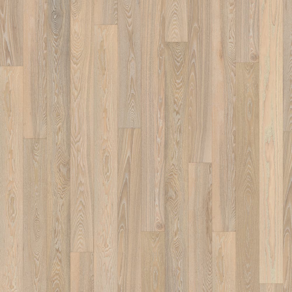 Трехполосная паркетная доска Karelia Polar Ясень Country Vanilla Matt имеет выбеленный оттенок. Благодаря маленьким плашкам, рисунок пола выглядит достаточно разнообразно и насыщенно, но при этом является совершенно неконтрастным.
